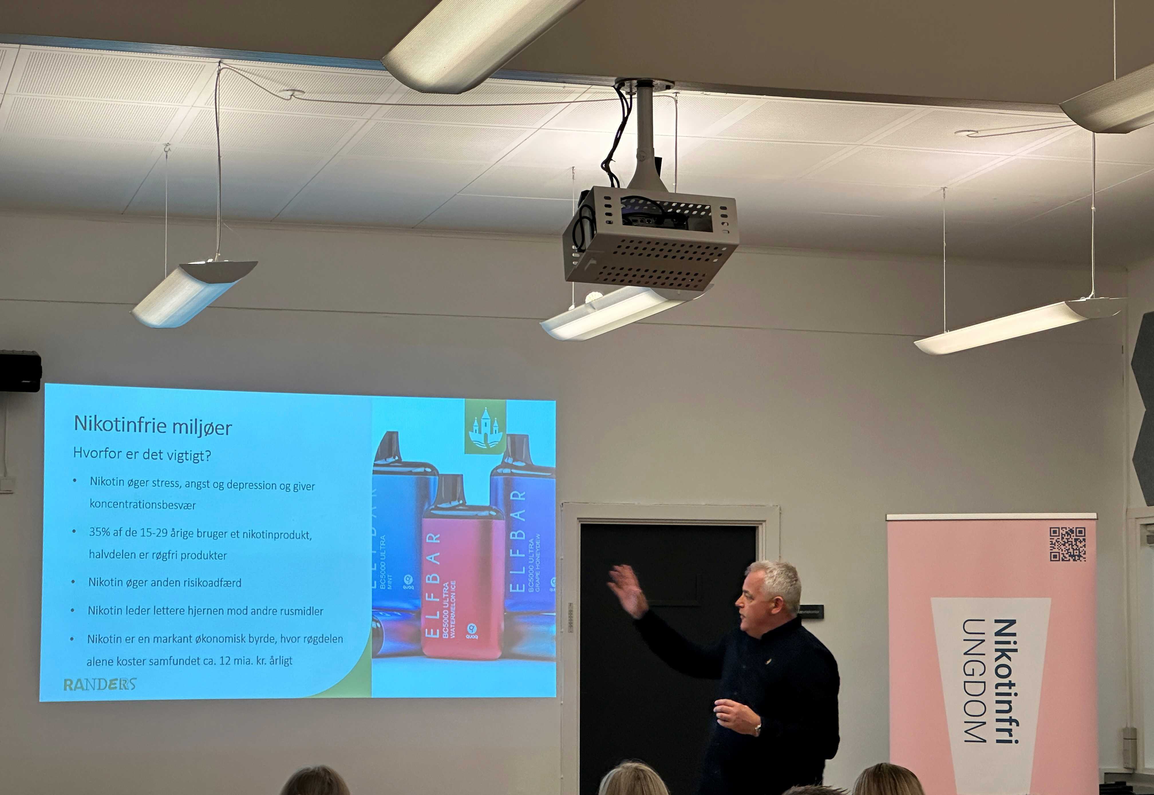 Til workshoppen præsenterede forebyggelseskonsulent i Randers Kommune, Poul Sejr data om den stigende brug af nikotinprodukter blandt unge – især nikotinprodukter som puff- og elfbars med smag af slik eller sodavand. Han fremhævede bl.a., at børn og unge hurtigere bliver afhængige af nikotin end voksne, og at nikotinprodukter kan øge risikoen for angst, stress, depression og give koncentrationsbesvær.
